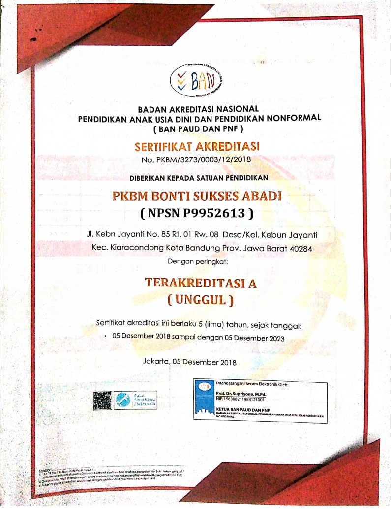 PKBM BSN TERAKREDITASI "A" Oleh BAN (Badan Akreditasi Nasional) Terhitung Sejak Tanggal 05 Desember 2018 sampai dengan 05 Desember 2023.